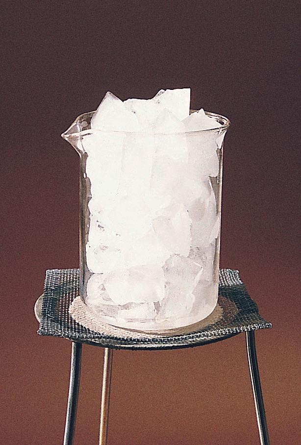 När isen värms blir molekylernas svängningar kraftigare. Molekylerna är inte längre bundna till bestämda platser. Isen smälter (vid 0°C).