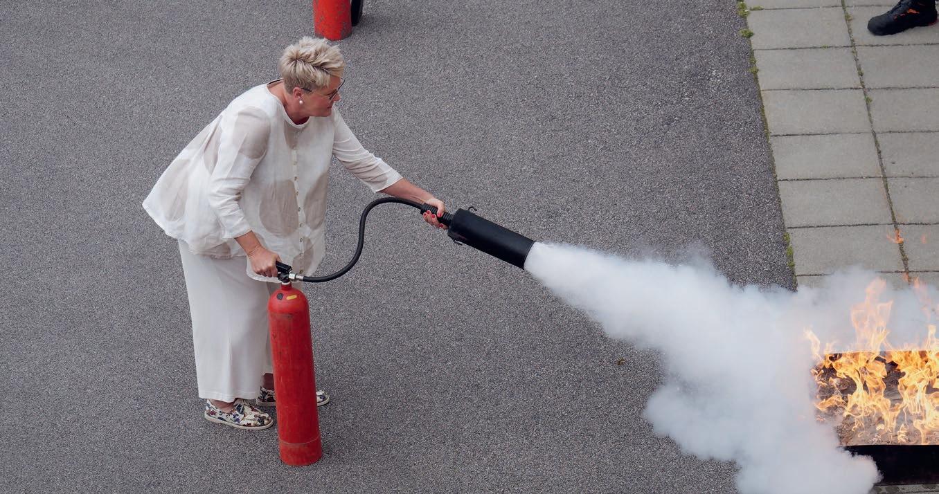10.Hur ska du rikta strålen om du ska släcka en brand med hjälp av en vattenslang eller en brandsläckare?