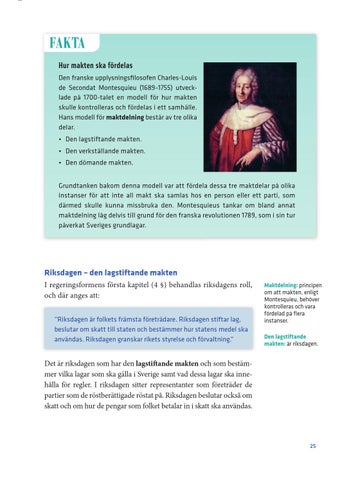 Hur makten ska fördelas Den franske upplysningsfilosofen Charles-Louis de Secondat Montesquieu (1689–1755) utvecklade på 1700-talet en modell för hur makten skulle kontrolleras och fördelas i ett samhälle. Hans modell för maktdelning består av tre olika delar. • Den lagstiftande makten. • Den verkställande makten. • Den dömande makten. Grundtanken bakom denna modell var att fördela dessa tre maktdelar på olika instanser för att inte all makt ska samlas hos en person eller ett parti, som därmed skulle kunna missbruka den. Montesquieus tankar om bland annat maktdelning låg delvis till grund för den franska revolutionen 1789, som i sin tur påverkat Sveriges grundlagar.