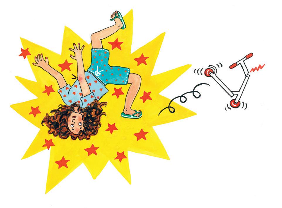 Jag gjorde fart med foten. Sen började jag rulla. Det var en bra backe för sparkcyklar. Den var inte brant, men den var lång. Hela vägen från torget hem till oss.
