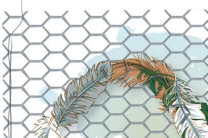 fjädrar från marken. Han flätar in fjädrarna i hönsnätet så att de bildar en ring.