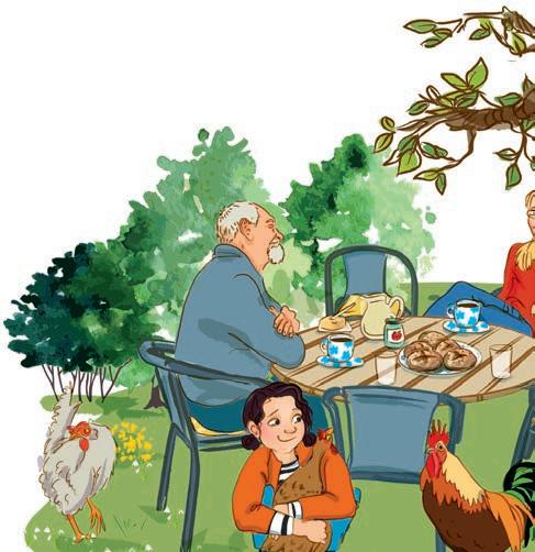 I trädgården finns flera gamla äppelträd och intill husväggen växer snödroppar och krokus. Mitt på gräsmattan står ett träbord och några plaststolar. Lasse torkar av möblerna och lägger ut dynor medan Villes mamma ställer fram ett fat med scones. Hon häller upp kaffe i stora blommiga koppar. Dima och Ville får flädersaft.