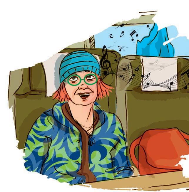 Dima och Ville sjunger lite tyst med i låten. En tant på sätet snett emot dem lyssnar när de sjunger. Hon ler mot dem.