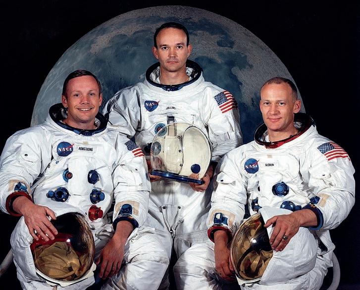 Här visas besättningen från den första månlandningen. Totalt genomfördes sex bemannade månlandningar, alla inom ramen för NASA:s Apollo-program mellan 1969 och 1972. En utbredd konspirationsteori hävdar att månlandningarna aldrig ägde rum, och anhängarna menar att de istället spelades in i en filmstudio.