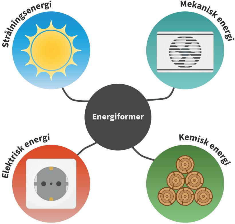 Energi finns i många olika former – till exempel elektrisk energi, kemisk energi, mekanisk energi och strålningsenergi. Det grundläggande sambandet är att energi aldrig kan försvinna eller skapas ur intet, utan bara omvandlas från en form till en annan. Detta är energiprincipen, också kallad lagen om energins bevarande.