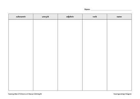 Kopieringsunderlag med fem olika rubriker som eleverna kan använda för att kategorisera ord och begrepp.
