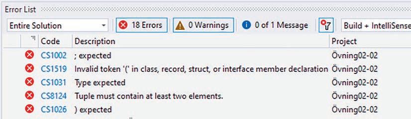 Som programmerare kommer du att få många kompileringsfel och det är bra att bli bekant med felmeddelandena tidigt. Lägg därför in några fel i övning 2.2 och se om du kan tolka felmeddelandena. Pröva till exempel först med att ta bort den första klammerparentesen, {, i Click-metoden. När du kompilerar programmet hittas flera fel trots att programmet bara innehåller ett. Felen visas i fönstret Error List som ligger under formulärfönstret.