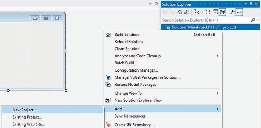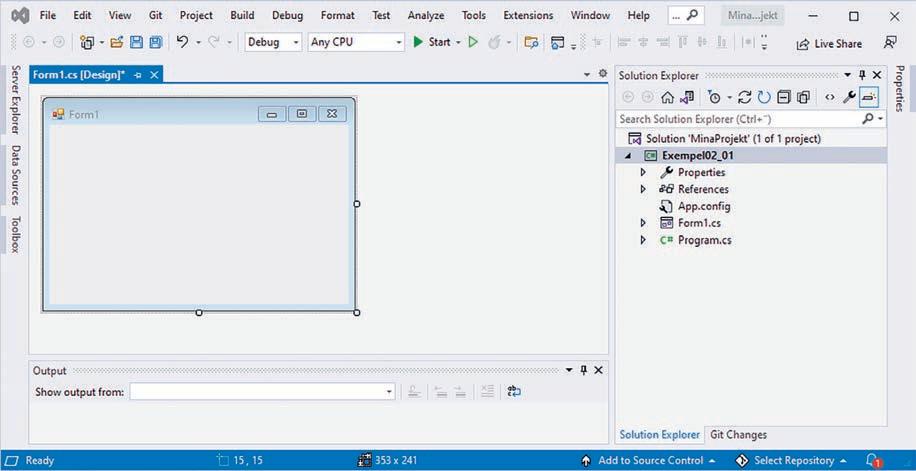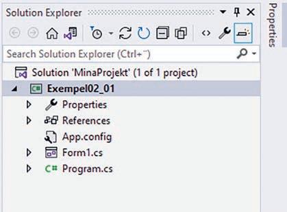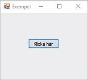 R ad 9–16: Även dessa rader skapas automatiskt av Visual Studio och deras exakta innebörd förklaras i senare kapitel i boken. I nuläget kan du bara acceptera att dessa rader behövs i alla program du skriver men för helhetens skull ges ändå en kortfattad beskrivning. Alla fönsterprogram i C# har samma grundläggande struktur och då det är ett objektorienterat språk bygger det på så kallade klasser. Vårt program består av en klass med namnet Form1. Beskrivningen av klassen inleds med en vänsterklammer på rad 12 och avslutas med en högerklammer på rad 22. Klassen ligger i en namnrymd (namespace) som har fått namnet Exempel02_02, rad 9. På raderna 13 till 16 definieras en så kallad konstruktor och dessa rader körs när fönstret skapas. Anropet InitializeComponent() på rad 15 har till uppgift att sätta egenskaperna för alla kontroller man lagt på sitt formulär. Här får till exempel formuläret titeln Exempel.