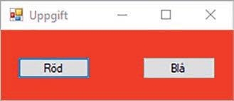 2.1 Skriv ett program som visar fönstret nedan. Formulärets bakgrundsfärg är röd när programmet startar. Vid klick på knappen Blå ska bakgrundsfärgen bli blå och vid klick på knappen Röd ska bakgrundsfärgen bli röd.