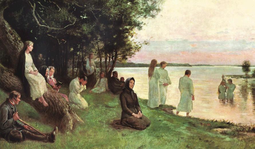 Målningen är från 1800-talet och föreställer baptister som döps i Mälaren. Vissa frikyrkor tycker att dopet ska ske när man är vuxen och själv kan ta ställning till sin tro.
