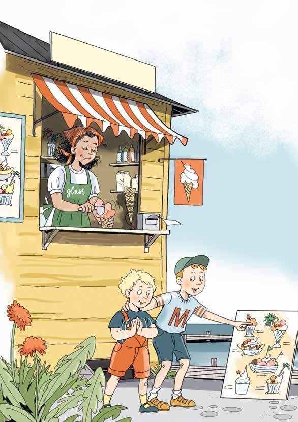 Det är första veckan i juli. Solen lyser och det är ännu en varm dag. Melvin står i kö för att köpa glass i Glasskafét. Han har sin lillebror Olle med sig.