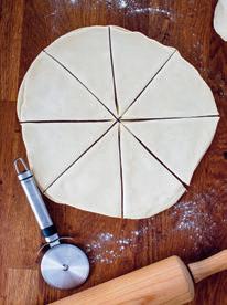 4. Kavla delarna till runda plattor på ca 30 cm i diameter. Bred på smör på en av rundlarna och lägg på den andra.