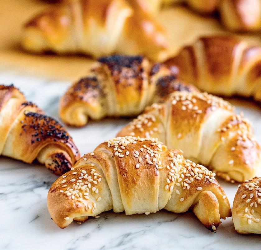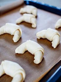 5. Sporra ut 8 tårtbitar. Rulla ihop från yttersidan och lägg skarven nedåt. Lägg på plåtar med bakplåtspapper.