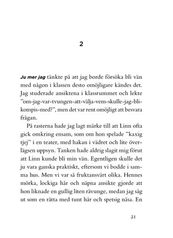 tänkte på att jag borde försöka bli vän med någon i klassen desto omöjligare kändes det. Jag studerade ansiktena i klassrummet och lekte ”om-jag-var-tvungen-att-välja-vem-skulle-jag-blikompis-med?”, men det var rent omöjligt att besvara frågan. På rasterna hade jag lagt märke till att Linn ofta gick omkring ensam, som om hon spelade ”kaxig tjej” i en teater, med hakan i vädret och lite överlägsen uppsyn. Tanken hade aldrig slagit mig förut att Linn kunde bli min vän. Egentligen skulle det ju vara ganska praktiskt, eftersom vi bodde i samma hus. Men vi var så fruktansvärt olika. Hennes mörka, lockiga hår och näpna ansikte gjorde att hon liknade en gullig liten rävunge, medan jag såg ut som en råtta med tunt hår och spetsig näsa. En Ju mer jag