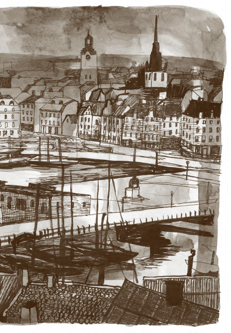 Arvid gick fram till staketet och såg ner på den bullrande staden. Han såg lyftkranarna som lastade båtarna i Stadsgårdshamnen. Han hörde slussvakterna blåsa i sina visselpipor. Det rök från ångbåtarna, segel och flaggor fladdrade ute på vattnet, måsarna skrek. Fiskförsäljarna vid Slussen ropade och stojade. Vagnar som drogs av hästar skramlade fram på ojämna gator.