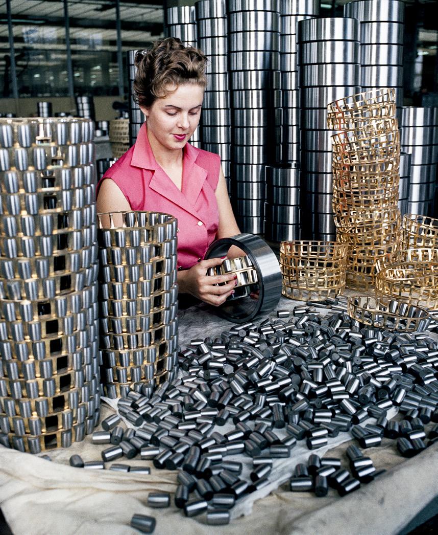 Assembling roller bearings in 1959. Roller bearings are a variation on ball bearings. Both types of bearings need to support heavy loads, so they are manufactured from vacuumtreated steel free from cracks and impurities.