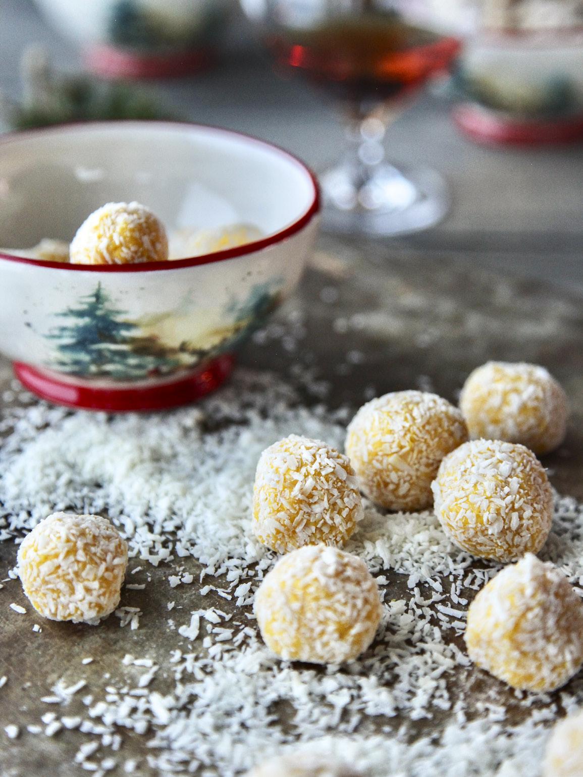 6. Ta upp smeten med en tesked och forma bollar med händerna. Rulla dem direkt i riven kokos och lägg dem på ett fat. Förvaras i kyl.