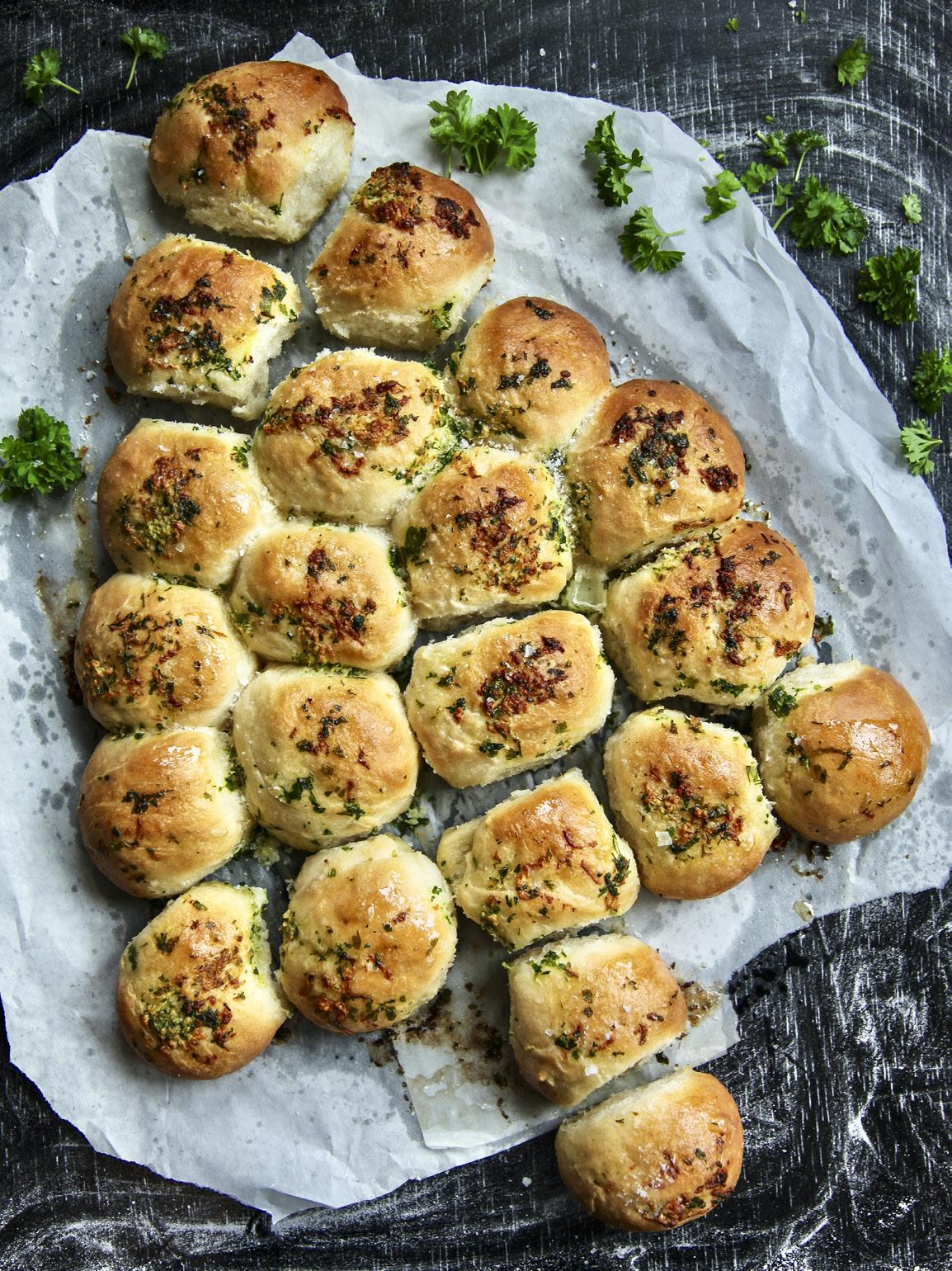 10. Skeda vitlökssmöret på brödet, strö över flingsalt och grädda i ugnen tills det fått fin, gyllene färg, cirka 20 minuter.