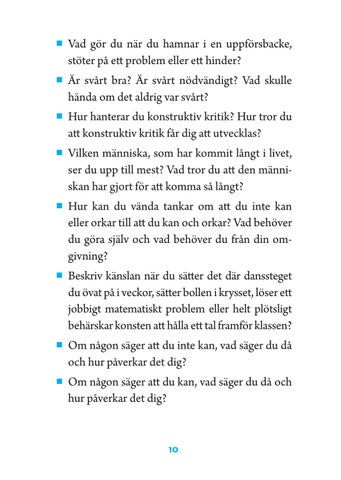 pp Vad gör du när du hamnar i en uppförsbacke, stöter på ett problem eller ett hinder? pp Är svårt bra? Är svårt nödvändigt? Vad skulle hända om det aldrig var svårt? pp Hur hanterar du konstruktiv kritik? Hur tror du att konstruktiv kritik får dig att utvecklas? pp Vilken människa, som har kommit långt i livet, ser du upp till mest? Vad tror du att den männi skan har gjort för att komma så långt? pp Hur kan du vända tankar om att du inte kan eller orkar till att du kan och orkar? Vad behöver du göra själv och vad behöver du från din om givning? pp Beskriv känslan när du sätter det där danssteget du övat på i veckor, sätter bollen i krysset, löser ett jobbigt matematiskt problem eller helt plötsligt behärskar konsten att hålla ett tal framför klassen? pp Om någon säger att du inte kan, vad säger du då och hur påverkar det dig? pp Om någon säger att du kan, vad säger du då och hur påverkar det dig?