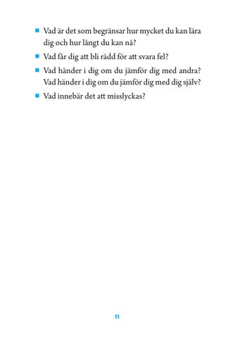 pp Vad är det som begränsar hur mycket du kan lära dig och hur långt du kan nå? pp Vad får dig att bli rädd för att svara fel? pp Vad händer i dig om du jämför dig med andra? Vad händer i dig om du jämför dig med dig själv? pp Vad innebär det att misslyckas?