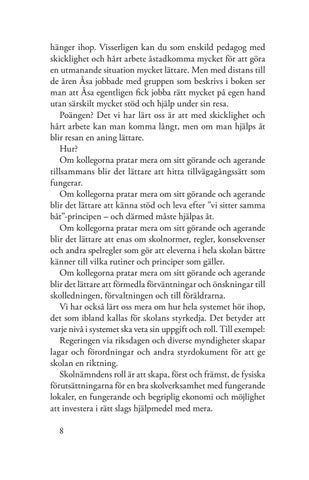 hänger ihop. Visserligen kan du som enskild pedagog med skicklighet och hårt arbete åstadkomma mycket för att göra en utmanande situation mycket lättare. Men med distans till de åren Åsa jobbade med gruppen som beskrivs i boken ser man att Åsa egentligen fick jobba rätt mycket på egen hand utan särskilt mycket stöd och hjälp under sin resa. Poängen? Det vi har lärt oss är att med skicklighet och hårt arbete kan man komma långt, men om man hjälps åt blir resan en aning lättare. Hur? Om kollegorna pratar mera om sitt görande och agerande tillsammans blir det lättare att hitta tillvägagångssätt som fungerar. Om kollegorna pratar mera om sitt görande och agerande blir det lättare att känna stöd och leva efter ”vi sitter samma båt”-principen – och därmed måste hjälpas åt. Om kollegorna pratar mera om sitt görande och agerande blir det lättare att enas om skolnormer, regler, konsekvenser och andra spelregler som gör att eleverna i hela skolan bättre känner till vilka rutiner och principer som gäller. Om kollegorna pratar mera om sitt görande och agerande blir det lättare att förmedla förväntningar och önskningar till skolledningen, förvaltningen och till föräldrarna. Vi har också lärt oss mera om hur hela systemet hör ihop, det som ibland kallas för skolans styrkedja. Det betyder att varje nivå i systemet ska veta sin uppgift och roll. Till exempel: Regeringen via riksdagen och diverse myndigheter skapar lagar och förordningar och andra styrdokument för att ge skolan en riktning. Skolnämndens roll är att skapa, först och främst, de fysiska förutsättningarna för en bra skolverksamhet med fungerande lokaler, en fungerande och begriplig ekonomi och möjlighet att investera i rätt slags hjälpmedel med mera. 8