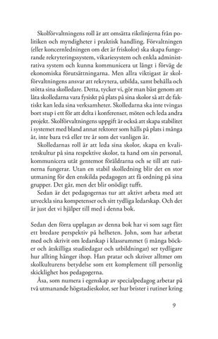 Skolförvaltningens roll är att omsätta riktlinjerna från politiken och myndigheter i praktisk handling. Förvaltningen (eller koncernledningen om det är friskolor) ska skapa fungerande rekryteringssystem, vikariesystem och enkla administ rativa system och kunna kommunicera ut långt i förväg de ekonomiska förutsättningarna. Men allra viktigast är skolförvaltningens ansvar att rekrytera, utbilda, samt behålla och stötta sina skolledare. Detta, tycker vi, gör man bäst genom att låta skolledarna vara fysiskt på plats på sina skolor så att de faktiskt kan leda sina verksamheter. Skolledarna ska inte tvingas bort stup i ett för att delta i konferenser, möten och leda andra projekt. Skolförvaltningens uppgift är också att skapa stabilitet i systemet med bland annat rektorer som hålls på plats i många år, inte bara två eller tre år som det vanligen är. Skolledarnas roll är att leda sina skolor, skapa en kvalitetskultur på sina respektive skolor, ta hand om sin personal, kommunicera utåt gentemot föräldrarna och se till att rutinerna fungerar. Utan en stabil skolledning blir det en stor utmaning för den enskilda pedagogen att få ordning på sina grupper. Det går, men det blir onödigt tufft. Sedan är det pedagogernas tur att aktivt arbeta med att utveckla sina kompetenser och sitt tydliga ledarskap. Och det är just det vi hjälper till med i denna bok. Sedan den förra upplagan av denna bok har vi som sagt fått ett bredare perspektiv på helheten. John, som har arbetat med och skrivit om ledarskap i klassrummet (i många böcker och åtskilliga studiedagar och utbildningar) ser tydligare hur allting hänger ihop. Han pratar och skriver alltmer om skolkulturens betydelse som ett komplement till personlig skicklighet hos pedagogerna. Åsa, som numera i egenskap av specialpedagog arbetar på två utmanande högstadieskolor, ser hur brister i rutiner kring 9