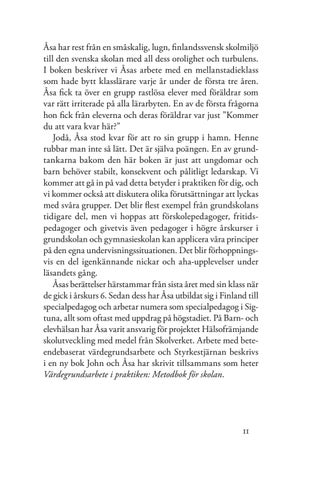 Åsa har rest från en småskalig, lugn, finlandssvensk skolmiljö till den svenska skolan med all dess orolighet och turbulens. I boken beskriver vi Åsas arbete med en mellanstadieklass som hade bytt klasslärare varje år under de första tre åren. Åsa fick ta över en grupp rastlösa elever med föräldrar som var rätt irriterade på alla lärarbyten. En av de första frågorna hon fick från eleverna och deras föräldrar var just ”Kommer du att vara kvar här?” Jodå, Åsa stod kvar för att ro sin grupp i hamn. Henne rubbar man inte så lätt. Det är själva poängen. En av grundtankarna bakom den här boken är just att ungdomar och barn behöver stabilt, konsekvent och pålitligt ledarskap. Vi kommer att gå in på vad detta betyder i praktiken för dig, och vi kommer också att diskutera olika förutsättningar att lyckas med svåra grupper. Det blir flest exempel från grundskolans tidigare del, men vi hoppas att förskolepedagoger, fritidspedagoger och givetvis även pedagoger i högre årskurser i grundskolan och gymnasieskolan kan applicera våra principer på den egna undervisningssituationen. Det blir förhoppningsvis en del igenkännande nickar och aha-upplevelser under läsandets gång. Åsas berättelser härstammar från sista året med sin klass när de gick i årskurs 6. Sedan dess har Åsa utbildat sig i Finland till specialpedagog och arbetar numera som specialpedagog i Sigtuna, allt som oftast med uppdrag på högstadiet. På Barn- och elevhälsan har Åsa varit ansvarig för projektet Hälsofrämjande skolutveckling med medel från Skolverket. Arbete med beteendebaserat värdegrundsarbete och Styrkestjärnan beskrivs i en ny bok John och Åsa har skrivit tillsammans som heter Värdegrundsarbete i praktiken: Metodbok för skolan.