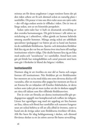 minnas att för dessa ungdomar i yngre tonåren fanns det på den tiden arbete att få och därmed också en naturlig plats i samhället. Då pratar vi inte om 1800-talet utan om 1960-talet – det vill säga endast sextio år tillbaka i tiden. Det är inte så länge sedan, sett ur ett historiskt perspektiv. Sedan 1960-talet har vi haft en dramatisk utveckling av den svenska barnomsorgen. Då gick kvinnor i allt större utsträckning ut i arbetslivet, vilket gjorde att barnen behövde omsorg utanför hemmet. Många ansåg också att utbildade specialister (pedagoger) var bättre på att ta hand om barnen än de outbildade föräldrarna. Sjuttio- och åttiotalens föräldrar fick lära sig att det var bra att lämna över sina barn till statliga institutioner relativt tidigt. Där skulle barnen lära sig att leka med andra och ”socialiseras” in i samhället. Antal barn som går på fritids har mångdubblats och antal procent små barn som går i förskolor är bland det högsta i världen.