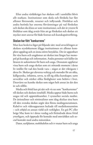 Skolan har fått ”konkurrens” Man kan beskriva läget på följande sätt: med utvecklingen av skolans styrdokument åläggs institutionen ett alltmer komplext uppdrag och en ännu större betydelse. Det är uppenbart för våra barn och ungdomar att skolan inte längre har monopol på kunskap och information. Andra personer och källor än läraren är auktoriteter för barn och unga. Dessutom uppfattar vissa barn och unga skolan som ett störande moment i deras liv istället för vad den borde vara – något av det viktigaste i deras liv. Skolan ger eleverna verktyg och metoder för att söka, källgranska, inhämta, sovra, ta till sig olika kunskaper, samt utvecklar och stärker olika färdigheter som behövs i livet. Dessvärre ses kanske skolan som något helt annat än det den är och tillför. Media och fritid kan på sätt och vis ses som ”konkurrenter” till skolan och skolans innehåll. Media upptar både barns och ungas tid och uppmärksamhet. I synnerhet sociala medier. De åttiotalister och nittiotalister som idag skickar sina barn till den svenska skolan utgör den första mediegenerationen. Kabel-tv och videoapparaten lockade till mediekonsumtion – och erbjöd en annan värld och verklighet. En grå PC eller beige Mac kom in i deras vardag och förändrade deras fritid ytterligare, och öppnade för kontakt med omvärlden och social kontakt med andra människor. Dator, surfplattor, mobiltelefon och tv matar barn och unga 17