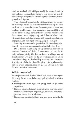 Vad krävs av en elev? Ta ett ögonblick och fundera på vad som krävs av en ung individ idag för att klara skolan med god trivsel och utmärkta resultat. • Förmåga att arbeta lugnt i en grupp med 20–30 andra ungdomar. • Förmåga att samarbeta och komma överens med människor med olika värderingar, begåvningar, intressen, kulturbakgrunder, sätt att lära och livsmål. • Förmåga att vara återhållsam med sina egna individuella 18