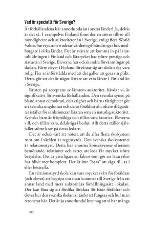 Vad är speciellt för Sverige? Är förhållandena här annorlunda än i andra länder? Ja, delvis är det så. I exempelvis Finland finns det en större tilltro till myndigheter och auktoriteter än i Sverige, enligt flera World Values Surveys som studerar värderingsförändringar hos medborgare i olika länder. Det är svårare att komma in på lärarutbildningen i Finland och läraryrket har större prestige och status än i Sverige. Eleverna har också andra förväntningar på skolan. Färre elever i Finland förväntar sig att skolan ska vara rolig. Fler är införstådda med att det gäller att göra sin plikt. Detta gör att det är något lättare att vara lärare i Finland än i Sverige. Bristen på acceptans av lärarens auktoritet, hävdar vi, är signifikativt för svenska förhållanden. Den svenska synen på bland annat demokrati, delaktighet och barns rättigheter gör att svenska ungdomar och deras föräldrar allt oftare ifrågasätter istället för sanktionerar läraren som en naturlig auktoritet. Svenska barn är frispråkiga och tillåts vara kreativa. Eleverna vill, och tillåts vara, delaktiga i beslut. Allt detta ställer självfallet större krav på deras ledare. Det är också värt att notera att de allra flesta skolsystem runt om i världen är regelstyrda. Den svenska skolsystemet är relationsstyrt. Detta har enorma konsekvenser eftersom bemötande, relationer och sättet att leda får mycket större betydelse. Det är ytterligare en faktor som gör att läraryrket har blivit mer komplext. Det är inte ”bara” att säga till, ta i eller bestraffa. En relationsstyrd skola kan vara mycket svårt för föräldrar (och elever) att begripa om man kommer till Sverige från ett annat land med mera auktoritära förhållningssätt i skolan. Det kan löna sig att försöka förklara för både föräldrar och elever hur den svenska skolan är tänkt att fungera och hur man resonerar här. Det är ju annorlunda! Inte nog att vi har många 20