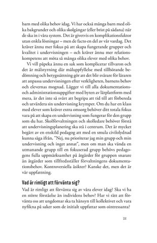 barn med olika behov idag. Vi har också många barn med olika bakgrunder och olika skolgångar (eller brist på sådana) när de ska in i våra system. Det är givetvis en komplikationsfaktor utan enkla lösningar – men de facto en del av vår vardag. Det kräver ännu mer fokus på att skapa fungerande grupper och kvalitet i undervisningen – och kräver ännu mer relationskompetens att möta så många olika elever med olika behov. Vi vill påpeka ännu en sak som komplicerar tillvaron och det är målstyrning där måluppfyllelse med tillhörande bedömning och betygssättning gör att det blir svårare för läraren att anpassa undervisningen efter verkligheten, barnens behov och elevernas mognad. Lägger vi till alla dokumentationsoch administrationsuppgifter med byten av lärplattform med mera, är det inte så svårt att begripa att tid till att förbereda och utvärdera sin undervisning krymper. Om du har en klass med elever som kräver extra omsorg behöver ditt totala fokus vara på att skapa en undervisning som fungerar för den grupp som du har. Skolförvaltningen och skolledare behöver förstå att undervisningsplanering ska stå i centrum. Det är mycket begärt av en enskild pedagog att med en smula civilolydnad kunna säga ifrån, ”Nej, nu prioriterar jag min grupp och min undervisning och inget annat”, men om man ska vända en utmanande grupp till en fokuserad grupp behövs pedagogens fulla uppmärksamhet på åtgärder för gruppen snarare än åtgärder som tillfredsställer förvaltningens dokumentationsbehov. Kontroversiella åsikter? Kanske det, men det är vår uppfattning.