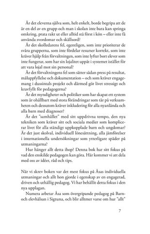 Är det eleverna själva som, helt enkelt, borde begripa att de är en del av en grupp och man i skolan inte bara kan springa omkring, prata rakt ut eller alltid stå först i kön – eller inte få använda svordomar och skällsord? Är det skolledarens fel, egentligen, som inte prioriterar de svåra grupperna, som inte fördelar resurser korrekt, som inte kräver hjälp från förvaltningen, som inte lyfter bort elever som inte fungerar, som har sin lojalitet uppåt i systemet istället för att vara lojal mot sin personal? Är det förvaltningens fel som sätter sådan press på resultat, måluppfyllelse och dokumentation – och som kräver engagemang i dussintals projekt och därmed gör livet stressigt och kravfyllt för pedagogerna? Är det myndigheter och politiker som har skapat ett system som är ohållbart med stora förändringar som tär på verksamheten och dessutom kräver inkludering för alla nyanlända och alla barn med diagnoser? Är det ”samhället” med sitt uppdrivna tempo, den nya tekniken som kräver sitt och sociala medier som komplicerar livet för alla ständigt uppkopplade barn och ungdomar? Är det just skolval, individuell lönesättning, alla jämförelser i internationella undersökningar som ytterligare späder på utmaningarna? Hur hänger allt detta ihop? Denna bok har sitt fokus på vad den enskilde pedagogen kan göra. Här kommer vi att dela med oss av idéer, råd och tips. När vi skrev boken var det mest fokus på Åsas individuella utmaningar och allt hon gjorde i egenskap av en engagerad, driven och uthållig pedagog. Vi har behållit detta fokus i den nya upplagan. Numera arbetar Åsa som övergripande pedagog på Barnoch elevhälsan i Sigtuna, och blir alltmer varse om hur ”allt” 7