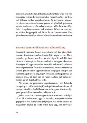 Barnets kommunikation och talutveckling Successivt nyanserar barnet sina uttryck och kan visa glÀdje, intresse, förnöjsamhet och missnöje. Efter nÄgra veckor, ibland mÄnader, ger barnet svarsleenden nÀr nÄgon ler och blir Àven bÀttre och bÀttre pÄ att fokusera och rikta sin uppmÀrksamhet. FörmÄgan till uppmÀrksamhet utvecklas och snart kan barnet hÄlla ett gemensamt fokus tillsammans med en annan mÀnniska. Denna gemensamma uppmÀrksamhet möjliggör samspel och samtal kring ett tredje ting, nÄgot bortanför samtalsparterna. Ett exempel Àr nÀr ett barn och en vuxen samtalar och pekar mot himlen nÀr ett flygplan flyger förbi. Att kunna ha gemensam uppmÀrksamhet och behÀrska turtagning Àr en förutsÀttning för mÄnga lekar och aktiviteter, till exempel att rulla en boll till varandra, att bygga ett klosstorn, lÀgga ett pussel tillsammans eller att lÀsa en bok. Jollret utvecklas sÄ smÄningom frÄn att vara enkla vokalljud till att bli stavelser som lÀggs pÄ varandra, exempelvis bababa, gagaga eller mer komplicerat jodijodijodi. NÀr barnet Àr runt ett Är gammalt brukar de första orden dyka upp, och nÀr barnet 10