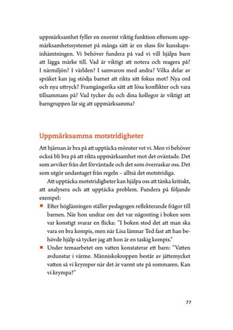 Uppmärksamma motstridigheter Att hjärnan är bra på att upptäcka mönster vet vi. Men vi behöver också bli bra på att rikta uppmärksamhet mot det oväntade. Det som avviker från det förväntade och det som överraskar oss. Det som utgör undantaget från regeln – alltså det motstridiga. Att upptäcka motstridigheter kan hjälpa oss att tänka kritiskt, att analysera och att upptäcka problem. Fundera på följande exempel: ØØ Efter högläsningen ställer pedagogen reflekterande frågor till barnen. När hon undrar om det var någonting i boken som var konstigt svarar en flicka: ”I boken stod det att man ska vara en bra kompis, men när Lisa lämnar Ted fast att han behövde hjälp så tycker jag att hon är en taskig kompis.” ØØ Under temaarbetet om vatten konstaterar ett barn: ”Vatten avdunstar i värme. Människokroppen består av jättemycket vatten så vi krymper när det är varmt ute på sommaren. Kan vi krympa?”