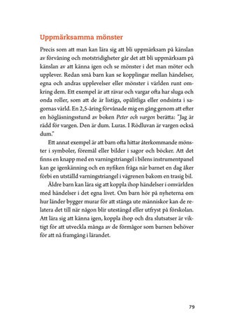 UppmĂ€rksamma mönster Precis som att man kan lĂ€ra sig att bli uppmĂ€rksam pĂ„ kĂ€nslan av förvĂ„ning och motstridigheter gĂ„r det att bli uppmĂ€rksam pĂ„ kĂ€nslan av att kĂ€nna igen och se mönster i det man möter och upplever. Redan smĂ„ barn kan se kopplingar mellan hĂ€ndelser, egna och andras upplevelser eller mönster i vĂ€rlden runt omkring dem. Ett exempel Ă€r att rĂ€var och vargar ofta har sluga och onda roller, som att de Ă€r listiga, opĂ„litliga eller ondsinta i sagornas vĂ€rld. En 2,5-Ă„ring förvĂ„nade mig en gĂ„ng genom att efter en höglĂ€sningsstund av boken Peter och vargen berĂ€tta: âJag Ă€r rĂ€dd för vargen. Den Ă€r dum. Luras. I Rödluvan Ă€r vargen ocksĂ„ dum.â Ett annat exempel Ă€r att barn ofta hittar Ă„terkommande möns ter i symboler, föremĂ„l eller bilder i sagor och böcker. Att det finns en knapp med en varningstriangel i bilens instrumentpanel kan ge igenkĂ€nning och en nyfiken frĂ„ga nĂ€r barnet en dag Ă„ker förbi en utstĂ€lld varningstriangel i vĂ€grenen bakom en trasig bil. Ăldre barn kan lĂ€ra sig att koppla ihop hĂ€ndelser i omvĂ€rlden med hĂ€ndelser i det egna livet. Om barn hör pĂ„ nyheterna om hur lĂ€nder bygger murar för att stĂ€nga ute mĂ€nniskor kan de relatera det till nĂ€r nĂ„gon blir utestĂ€ngd eller utfryst pĂ„ förskolan. Att lĂ€ra sig att kĂ€nna igen, koppla ihop och dra slutsatser Ă€r viktigt för att utveckla mĂ„nga av de förmĂ„gor som barnen behöver för att nĂ„ framgĂ„ng i lĂ€randet.