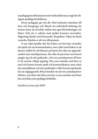 Àr pedagogerna tillsammans med vÄrdnadshavarna i regel de viktigaste sprÄkliga förebilderna. Dessa pedagoger ger sitt allt. Med medveten stimulans till barn och barngrupp, och ibland viss individuell stöttning, fÄr barnen chans att utvecklas utifrÄn sina egna förutsÀttningar och behov. Och nÀr vi arbetar med sprÄket kommer mervÀrden. NÄgonting hÀnder med lyssnandet. Respekten. Viljan att förstÄ varandra. KÀnslan av att vara tillsammans. à ena sidan handlar den hÀr boken om hur barn utvecklar sitt sprÄk och sin kommunikation, men syftet med boken Àr att lÀsaren istÀllet för att fokusera pÄ barnet ska rikta sin uppmÀrksamhet mot samtalspartnern, den eller de personer som barnet speglar sig och sitt sprÄkande i. Att vara samtalspartner till barn Àr ett enormt viktigt uppdrag. Den som samtalar med barn Àr med och formar barnets sprÄk och kommunikation, men ocksÄ det samtalsklimat och den sprÄkmiljö i vilket barnets sprÄkande har sin utgÄngspunkt. Boken handlar om att vara samtalspartner till barn, och riktar sitt fokus mot hur vi som samtalar med barn kan utvecklas som sprÄkliga förebilder. Karolina Larsson, juni 2019