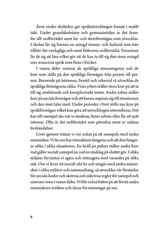 Ăven under skoltiden gĂ„r sprĂ„kutvecklingen framĂ„t i snabb takt. Under grundskoleĂ„ren och gymnasietiden Ă€r det framför allt ordförrĂ„det samt lĂ€s- och skrivförmĂ„gan som utvecklas. I skolan lĂ€r sig barnen en mĂ€ngd Ă€mnes- och fackord som inte tillhör det vardagliga och mest frekventa ordförrĂ„det. Dessutom lĂ€r de sig att lĂ€sa vilket gör att de kan ta till sig den stora mĂ€ngd mer avancerat sprĂ„k som finns i böcker. I vuxen Ă„lder varierar de sprĂ„kliga utmaningarna och de krav som stĂ€lls pĂ„ den sprĂ„kliga förmĂ„gan frĂ„n person till person. Beroende pĂ„ intressen, livsstil och yrkesval sĂ„ utvecklas de sprĂ„kliga förmĂ„gorna olika. Vissa yrken stĂ€ller stora krav pĂ„ att ta till sig omfattande och komplicerade texter. Andra yrken stĂ€ller krav pĂ„ sociala förmĂ„gor och att kunna anpassa sig till situationen och den man talar med. Under perioder i livet stĂ€lls nya krav pĂ„ sprĂ„kförmĂ„gan vilket kan göra att utvecklingen intensifieras. Det kan till exempel ske nĂ€r vi studerar, byter arbete eller fĂ„r ett nytt intresse. Ofta Ă€r det ordförrĂ„det som pĂ„verkas mest av sĂ„dana livshĂ€ndelser. Livet igenom trĂ€nar vi oss ocksĂ„ pĂ„ att samspela med andÂra mĂ€nniskor. Vi lĂ€r oss hur interaktion fungerar och att den fungerar olika i olika situationer. En kvĂ€ll pĂ„ puben stĂ€ller andra krav vad gĂ€ller socialt samspel Ă€n vad en middag pĂ„ slottet gör. I olika miljöer förvĂ€ntas vi agera och interagera med varandra pĂ„ olika sĂ€tt. Om vi lever ett socialt rikt liv och umgĂ„s med andra mĂ€nniskor i olika miljöer och sammanhang, sĂ„ utvecklas vĂ„r förstĂ„else för sociala koder och skrivna och oskrivna regler för samspel och samvaro Ă€ven i vuxen Ă„lder. Vi blir ocksĂ„ bĂ€ttre pĂ„ att förstĂ„ andra mĂ€nniskors avsikter och deras förvĂ€ntningar pĂ„ oss.
