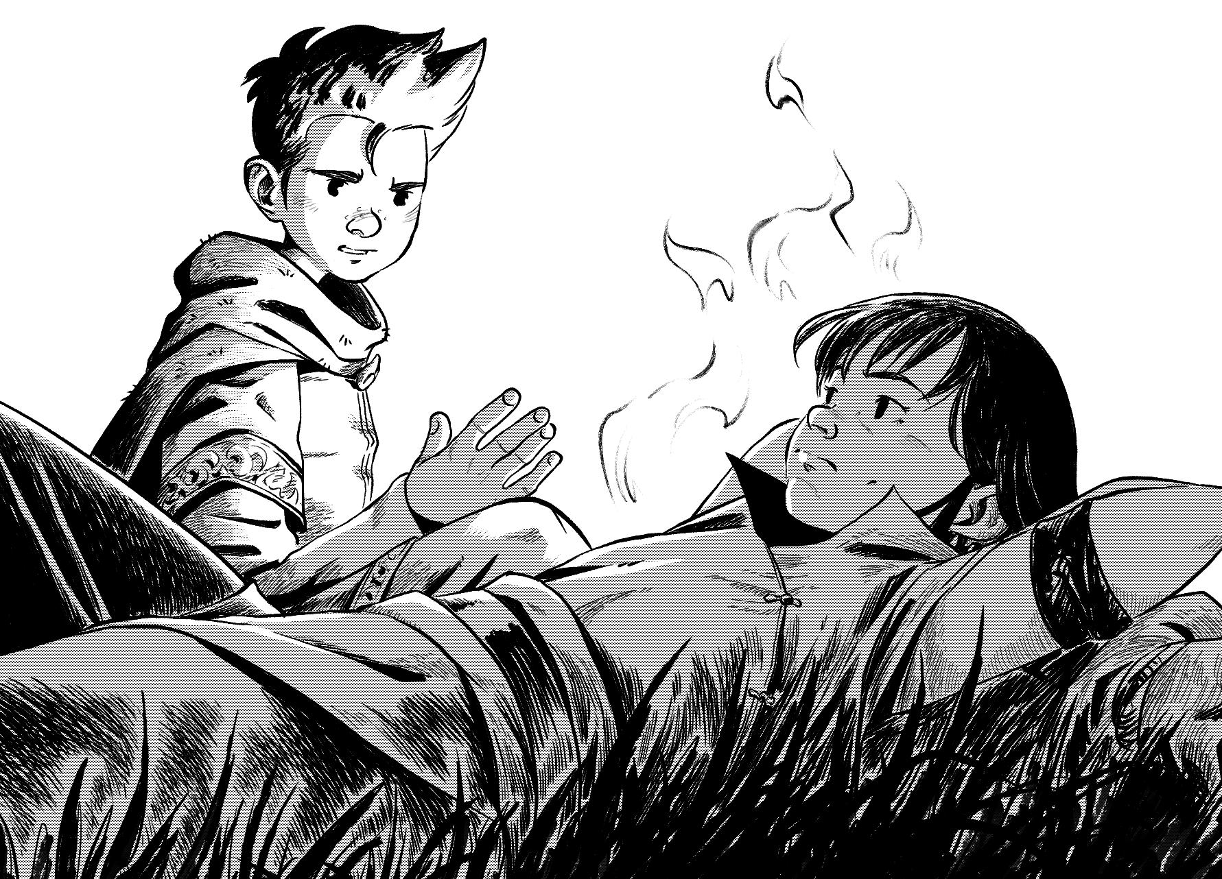 Solen stod lågt på himlen och det hade börjat mörkna när en glänta dök upp i skogstäcket. Aquila cirklade ner och landade intill en stor ek. Hon fällde ihop vingarna och la sig bland de knotiga rötterna. Remus och Ardele hämtade några torra kvistar, och snart spred en liten lägereld ett varmt sken omkring sig. När de ätit bredde de ut sina filtar på marken.