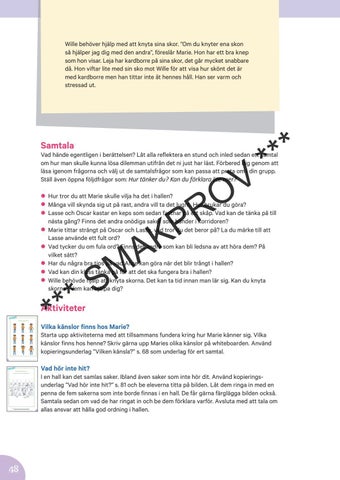 Starta upp aktiviteterna med att tillsammans fundera kring hur Marie känner sig. Vilka känslor finns hos henne? Skriv gärna upp Maries olika känslor på whiteboarden. Använd kopieringsunderlag ”Vilken känsla?” s. 68 som underlag för ert samtal. 68
