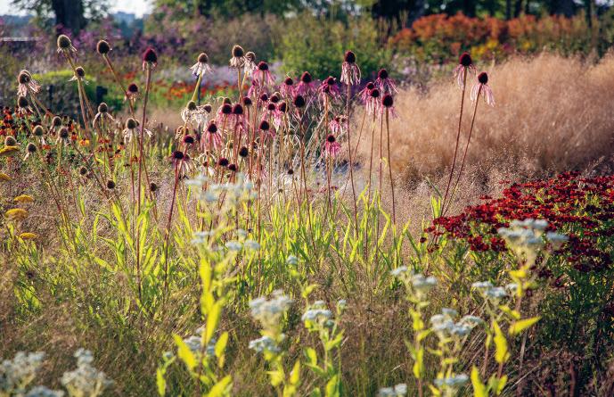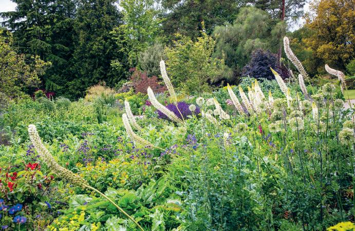 blandad E rabatt E r , där perenner kombineras med buskar, lökväxter samt två- och ettåringar, är mycket vanliga i Storbritannien, som här hos Beth Chatto där stäpplilja har huvudrollen i juni.
