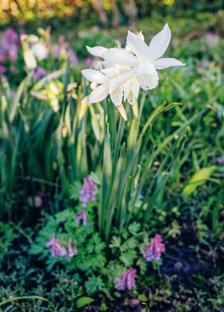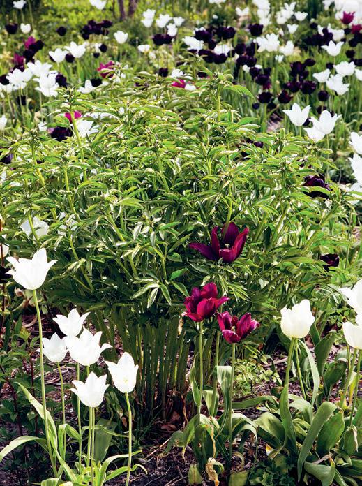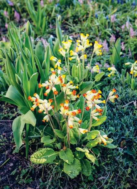 PE riod E n som kan kallas sen vår eller tidig försommar är kort men intressant eftersom det känns som om årstiderna möts i ett grönt fyrverkeri. Samtidigt som många vårblommor är på sin höjdpunkt börjar knopparna på försommarens perenner slå ut. De mer senblommande arterna och sorterna av narcisser och tulpaner samspelar med perennerna. Det sker antingen genom att de blommar intill de gröna skott som skjuter upp underifrån eller genom att blomma samtidigt, vilket ger härliga kombinationer i form och färg. När det blir lyckat blir det väldigt vackert! Vissen lökblast kan gömmas under de uppvuxna perennerna.