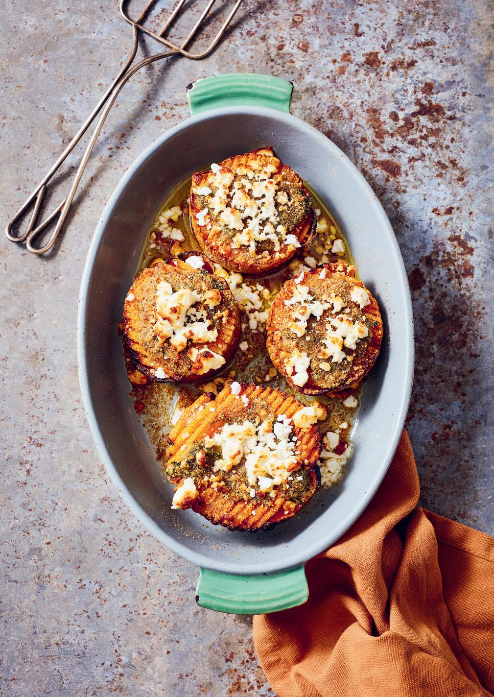 5. Ta ut den förbakade pumpan och bred på örtsmöret. Strö över 2 matskedar ströbröd och smula över hälften av fetaosten. Fortsätt baka i cirka 20 minuter.