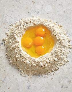 2. Knäck äggen i gropen, ta en gaffel och slå sönder dem. Rör sedan gaffeln i en cirkelform så att mer och mer mjöl tas upp av äggen. Till slut använder du händerna och arbetar ihop allt till en seg deg.
