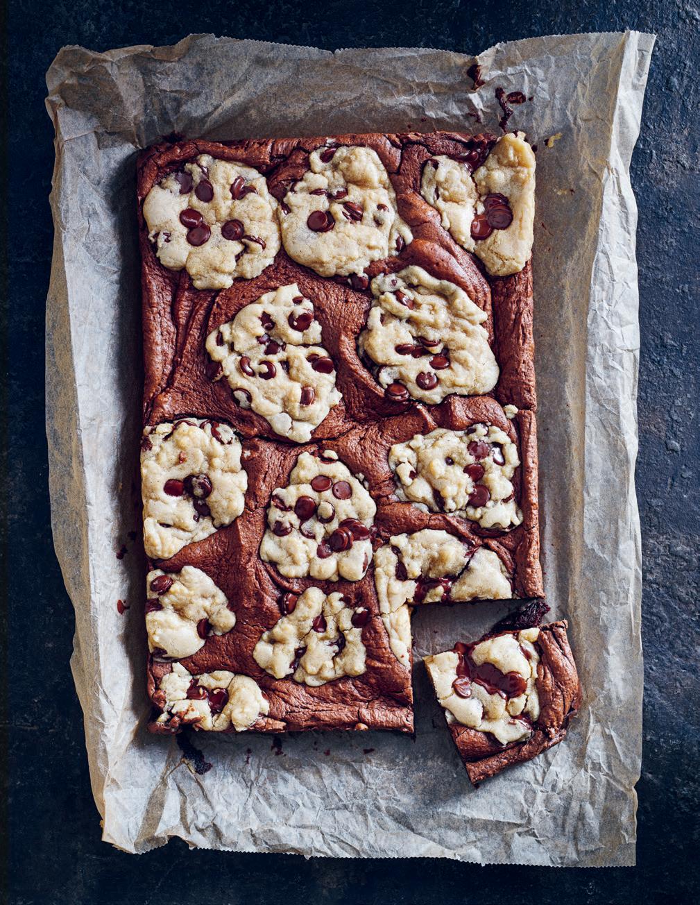7. Ta ut kakdegen från kylskåpet och dela den i mindre bitar. Strö bitarna över browniesmeten. Grädda mitt i ugnen i 25–28 minuter. Ta ut och låt svalna innan du skär upp brookien i rutor.