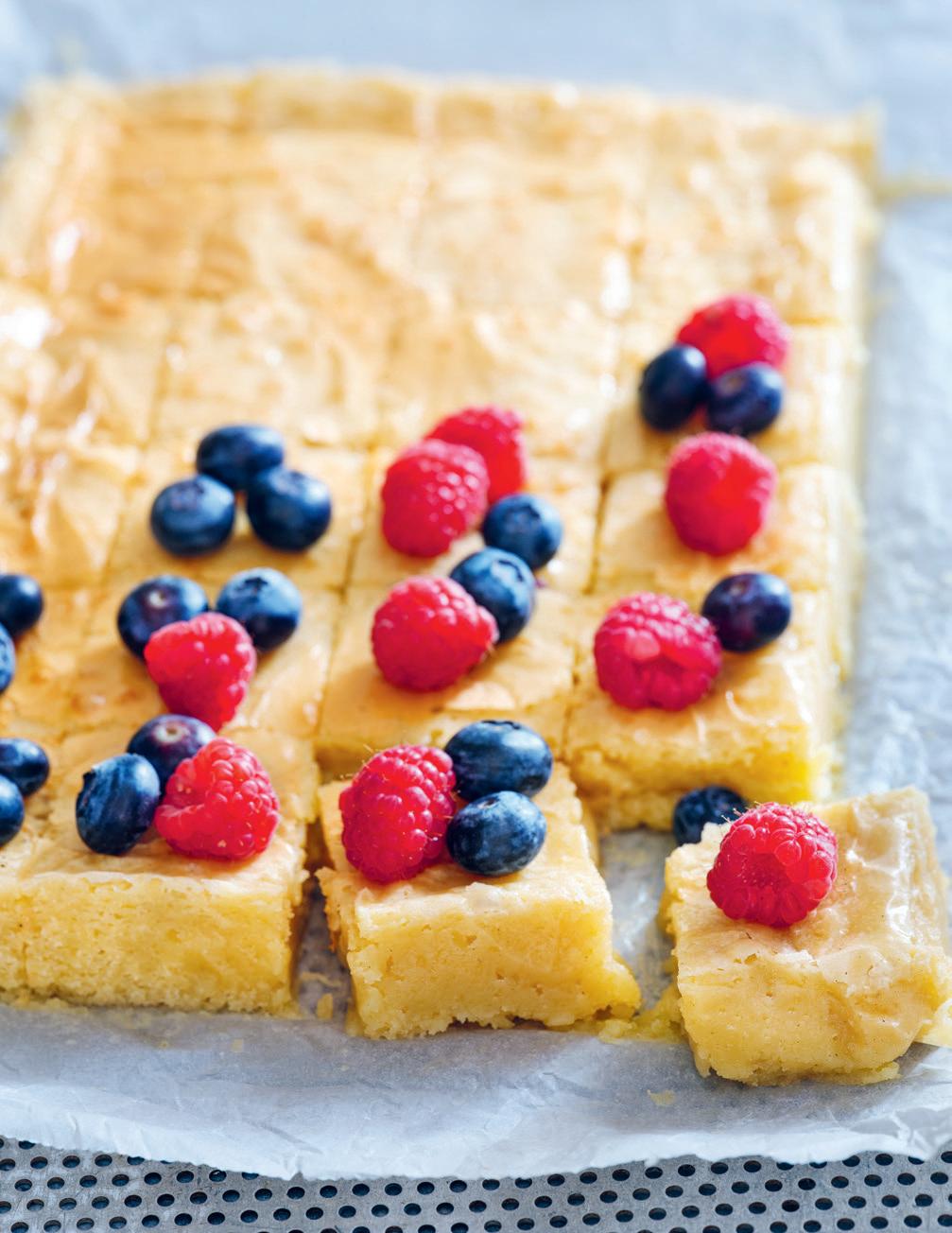 5. Ta ut och låt blondien svalna helt, gärna i kylskåp, innan du skär i den. Servera med färska bär.