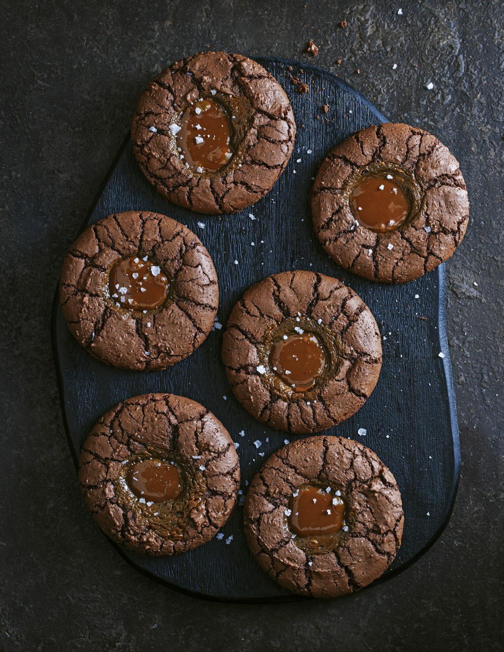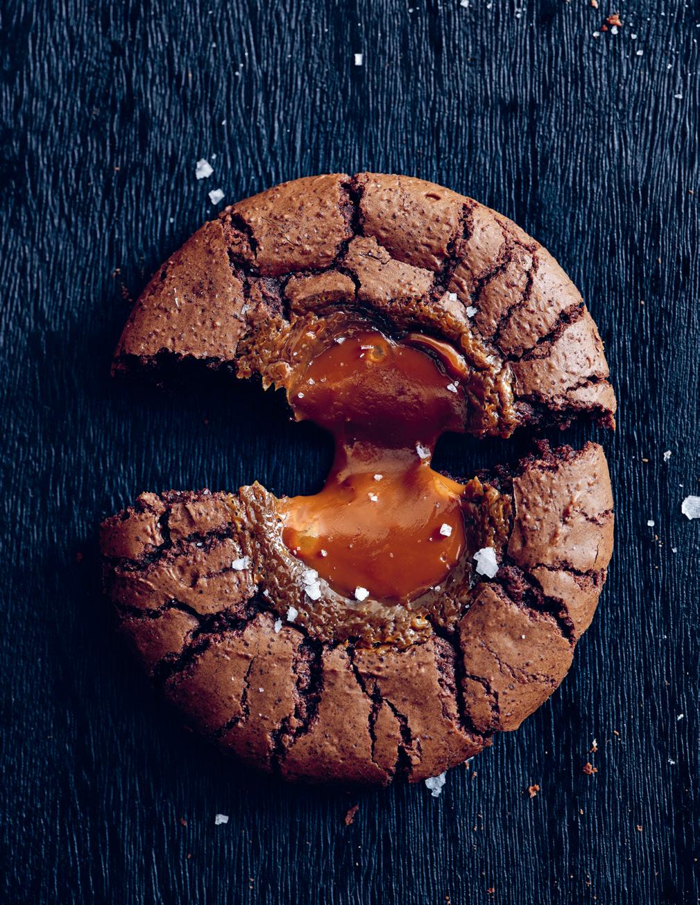 5. Klicka ut 16 jämnstora kakor på plåtarna, 8 på varje med gott om utrymme emellan. Spritsa eller klicka ut karamelliserad mjölk i mitten av varje kaka. Grädda mitt i ugnen i cirka 10 minuter. Ta ut och strö på flingsalt.