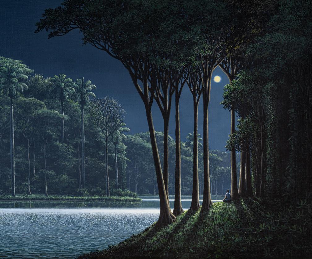 Jag minns en kvä ll s ä rskilt vä l. Det ä r fullm å ne. Stjä rnklart. Vindstilla. Vi sitter i den vackra meditationshallen med stora, öppna fönster utan glas. Den tropiska naturskogen utanför bjuder på en häpnadsväckande mångfald av ljud: f åglar, insekter, prasslet av löv när djur rör sig fram över marken. Den välbekanta lukten av rökelse och tigerbalsam kommer och går. Templets innanmäte lyses upp av hundratals stearinljus. Salen är kvä llen till ä ra vackert utsmyckad med lotusblommor, och längst fram sitter två gigantiska, nypolerade mässingsbuddhor och skiner. De är cirka tre meter höga och varje vecka, dagen innan en sådan här nattlig meditation, har trettio munkar omsorgsfullt gnuggat statyerna med Brasso, för att de ska bli ännu mer gyllene i ljusens sken.