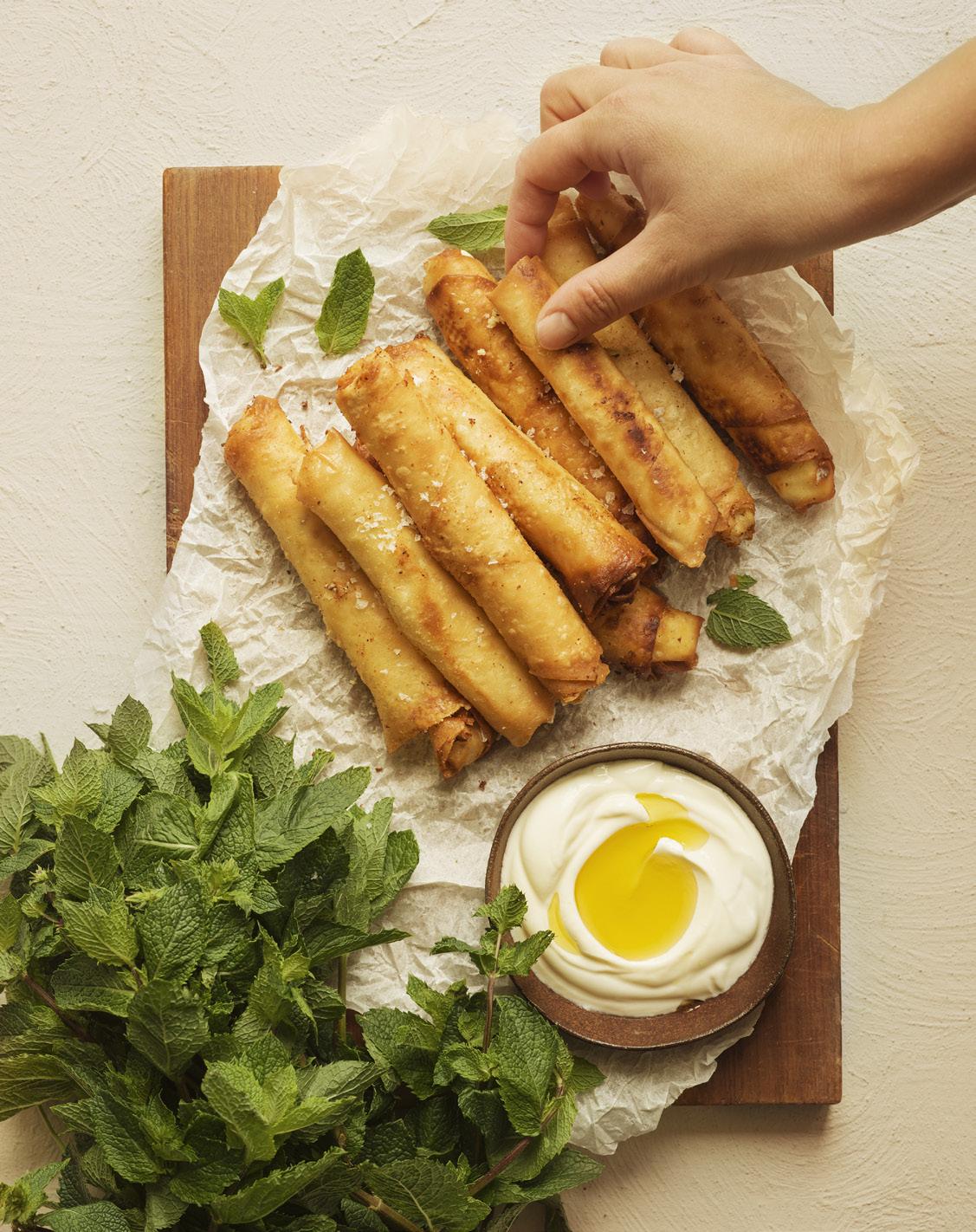 ⹠VÀrm oljan till cirka 180 grader i en kastrull. Fritera filodegsrullarna i omgÄngar tills de blir gyllenbruna. De fÄr snabbt fÀrg, sÄ hÄll noga koll. LÄt rullarna rinna av pÄ hushÄllspapper. Servera dem varma eller ljumna, gÀrna tillsammans med turkisk yoghurt toppad med lite olivolja.
