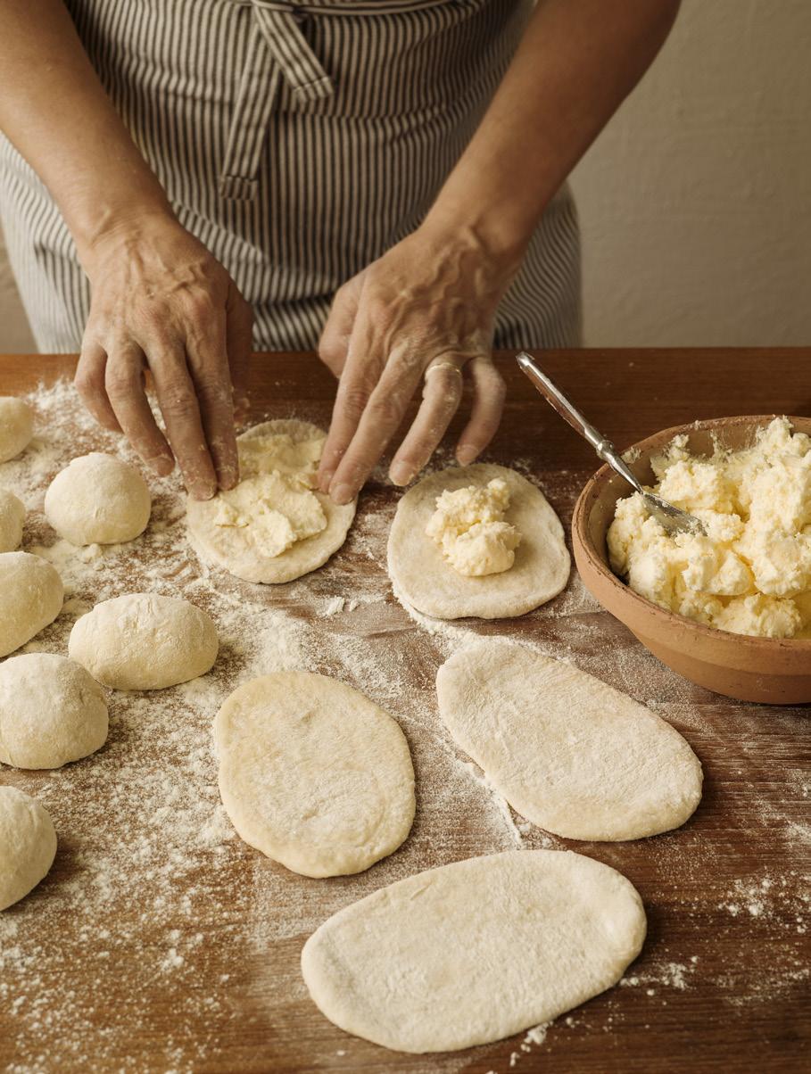 âą LĂ€gg 1â1 œ matsked fyllning i mitten av varje degrundel. Vik upp kanterna sĂ„ att degen bildar en bĂ„tform, nyp ihop lĂ€tt i Ă€ndarna men lĂ€mna fyllningen synlig i mitten. Kanterna ska vara tydligt uppvikta, sĂ„ att det blir som en öppen pirog eller en liten paj, och inte platta som pĂ„ en pizza.